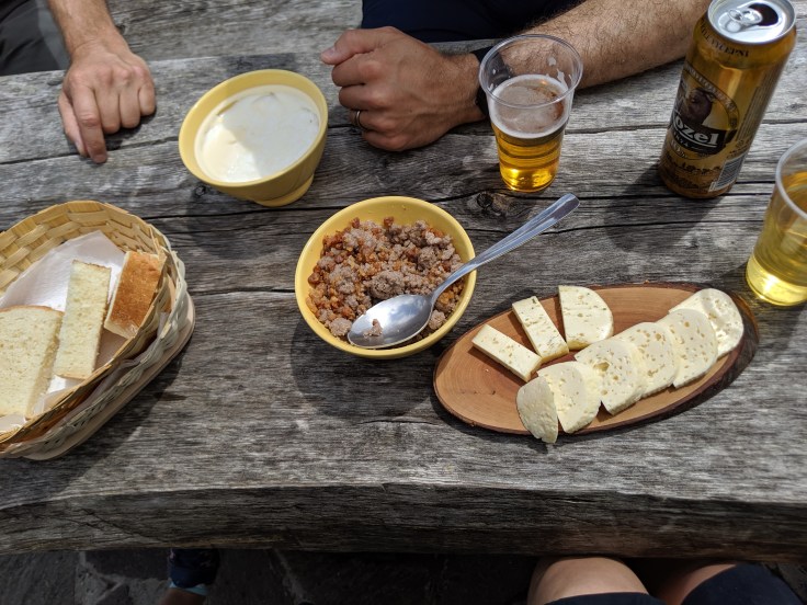In the village, we stopped for a quick famers lunch. Katy had a cheese plate while I had some mush with crackling, a bowl of sour milk and a beer. The mush and crackling was surprisingly good. The sour milk wasn’t really my thing, but I finished it up to avoid being rude, especially considering Bostjan said that the farmers likely had these options for three meals a day while tending their herds.