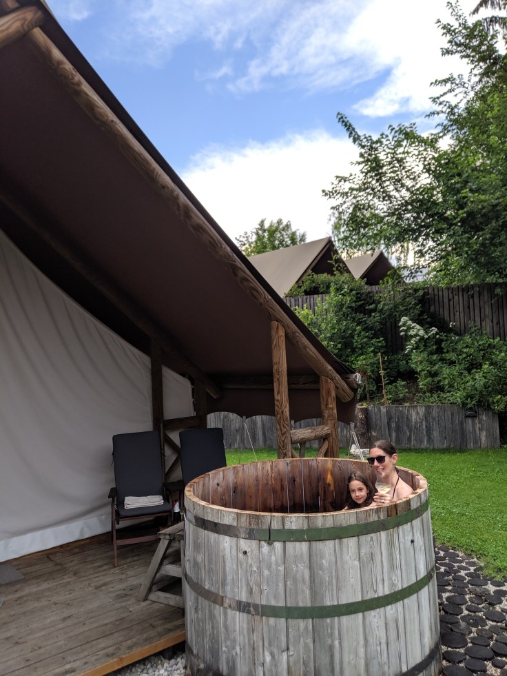 While we had been out exploring, the hotel staff had kindly moved our bags out of the tree house and into our glamping tent, complete with a wooden hot tub.
